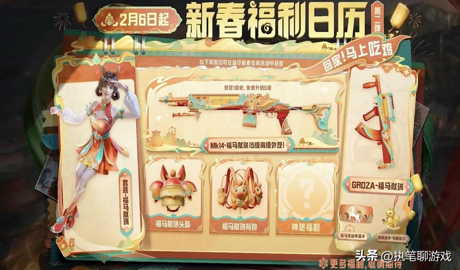 第二彈則是從2.6開啓,此次光子拿出來的是福馬獻瑞系列的新套裝、5級MK14、Groza、頭盔、揹包、掛件以及降落傘等皮獎勵。