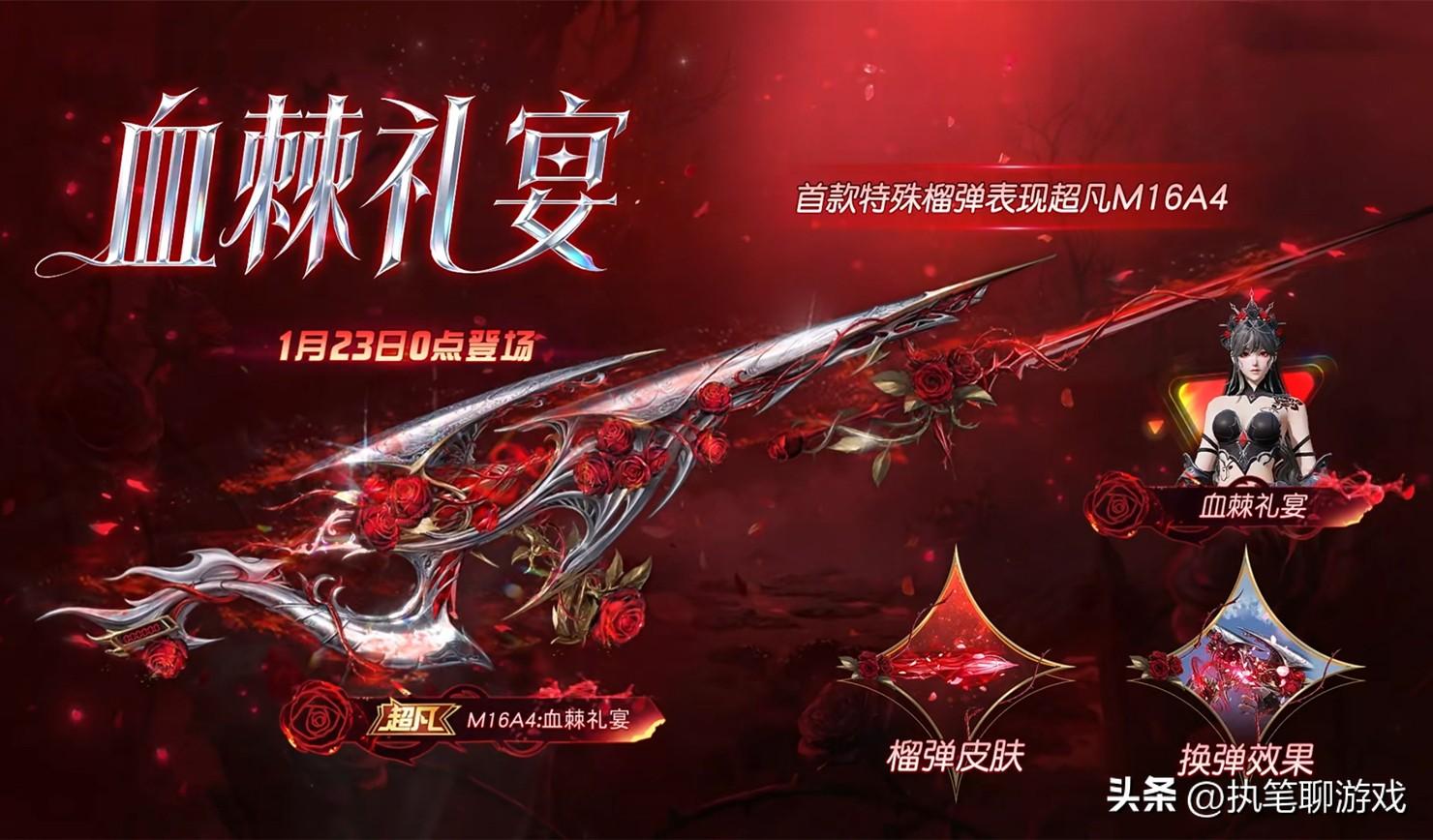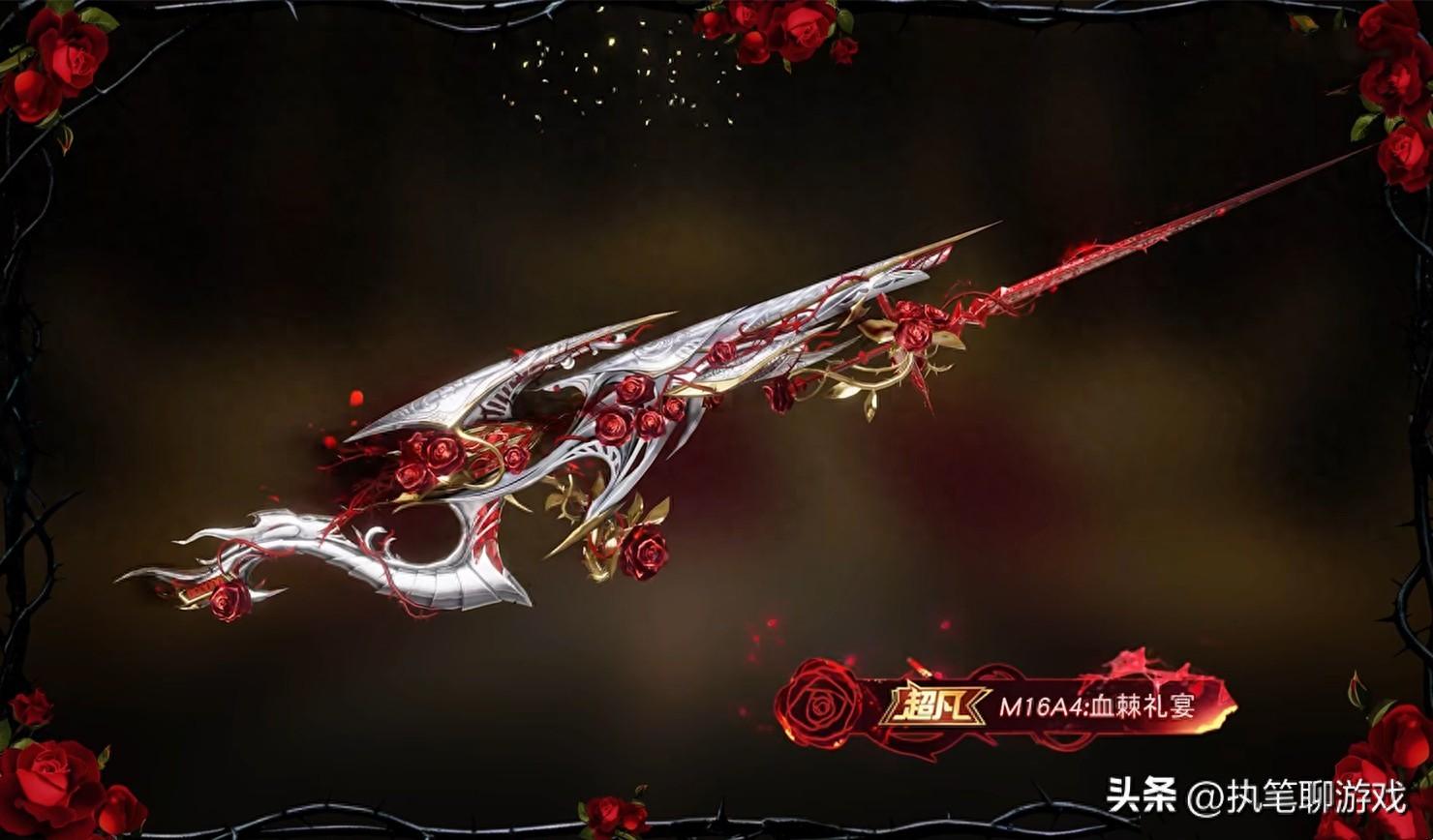 如圖所示,我們就以周5新軍需“血棘禮宴”的升級槍爲例,重新建模之後完全看不出這是M16A4,玫瑰、黑皮的進階外觀,高級外觀則變成了白金版,看起來相當炫酷。