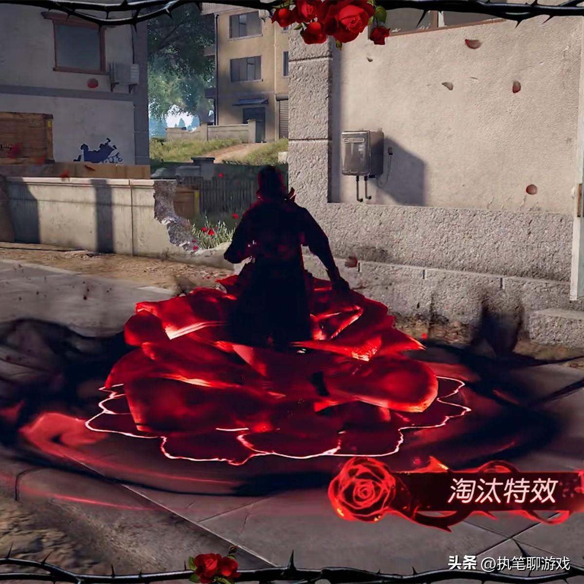 再來看一下“淘汰特效”,玩家化成紅色玫瑰從地面上升起,然後變成一把劍插在地上的盒子,整體特效給人的觀感就是極爲炫酷,完全能夠與和平里的9級槍相提並論,甚至在特效表現的方式上還要有過之而無不及。