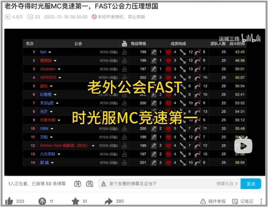 不止如此,這幫老外還頂着起號慢、參與晚的壓力,憑藉獨特的遊戲理解,上來就在熔火之心的競速榜上打出42分45秒,一度登頂國服,狠狠打了所有國服玩家的臉。