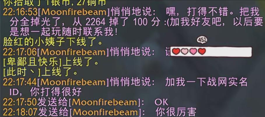 美服2v2競技場No.1級別的大神Moonfirebeam更絕。在時光服競技場被國服玩家打敗,把競技分全部掉光後,不光不噴垃圾話,還主動用中文發私信求加好友,誇獎中國玩家打得很好,以後想一起玩隨時可以聯繫他。
