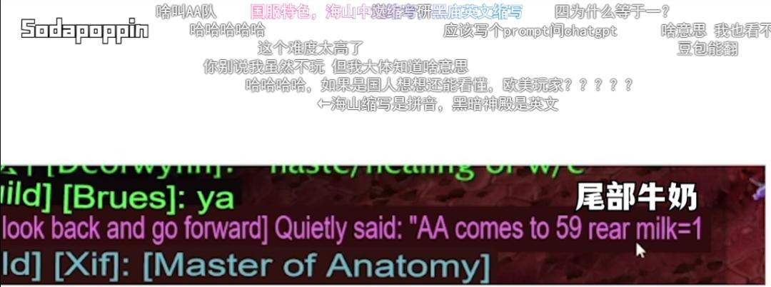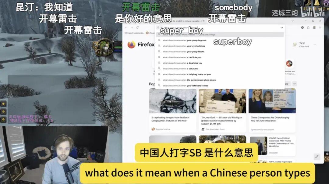 那時候,滿屏的111、NB、==(等等)和翻譯器CPU過載的場面,像是一場老外出現人傳人現象導致的大型文化交流觀光會。你會看到,全網千萬粉絲的大主播Sodapoppin把SB當成“帥比”記小本本,也有人連嗑瓜子都要追問“中國人爲什麼喫太陽花種子”。