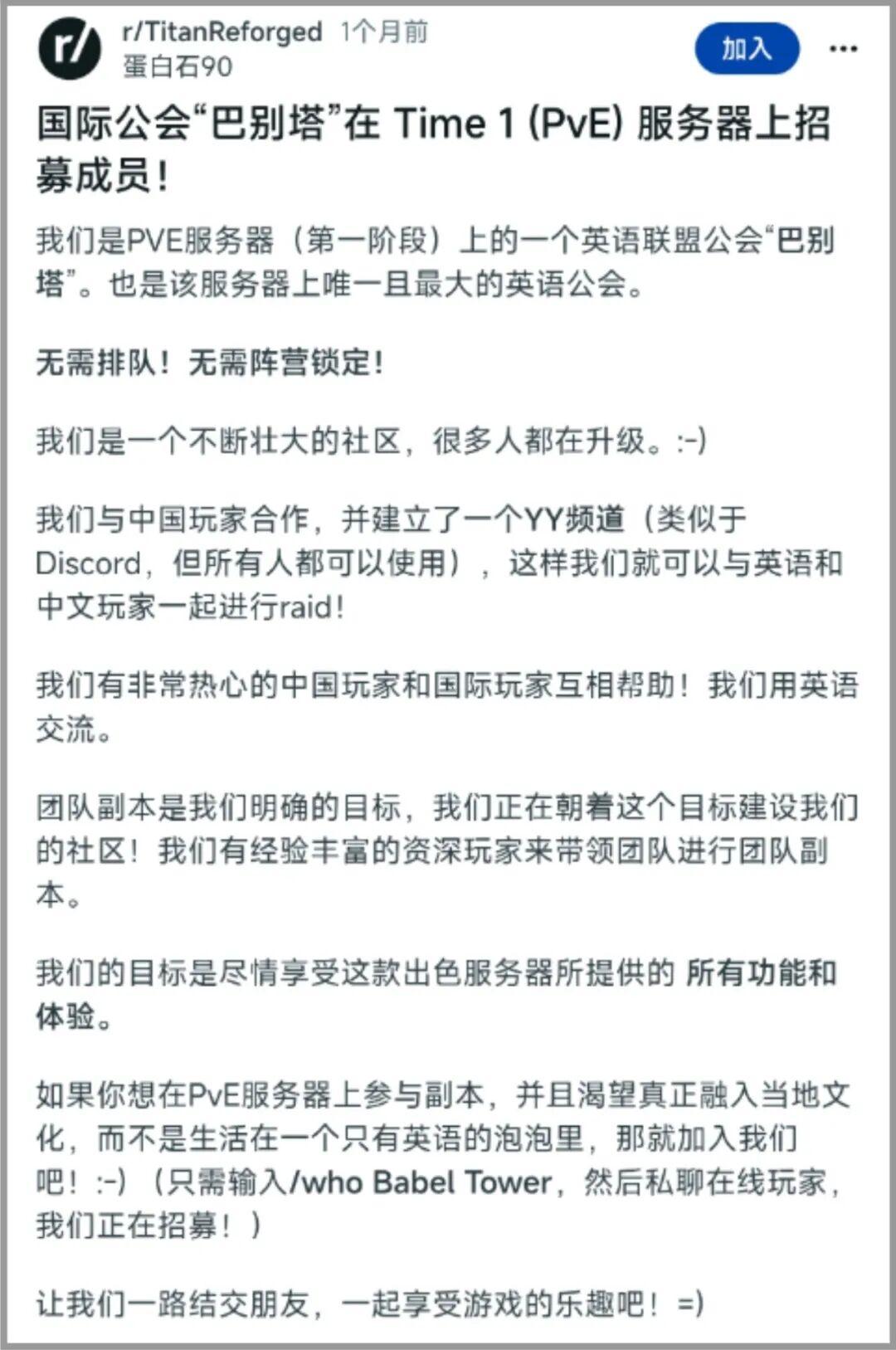 一個名爲“Babel Tower”(巴別塔)的國際公會,在Reddit上發佈招募帖。他們的口號很有意思:“我們與中文玩家合作,並建立了一個YY語音頻道,目標是想要真正融入當地文化,而不是活在純粹的英語泡泡——也就是信息繭房裏。”