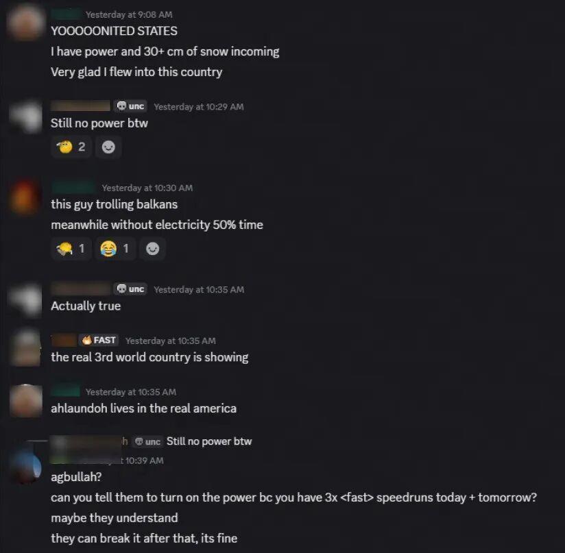這種基礎設施上的打擊,讓一些老外玩家忍不住恰檸檬了,陰陽怪氣地調侃,“咱這個網速才符合第三世界國家的標準,羨慕中國老哥強悍的國家電網”。