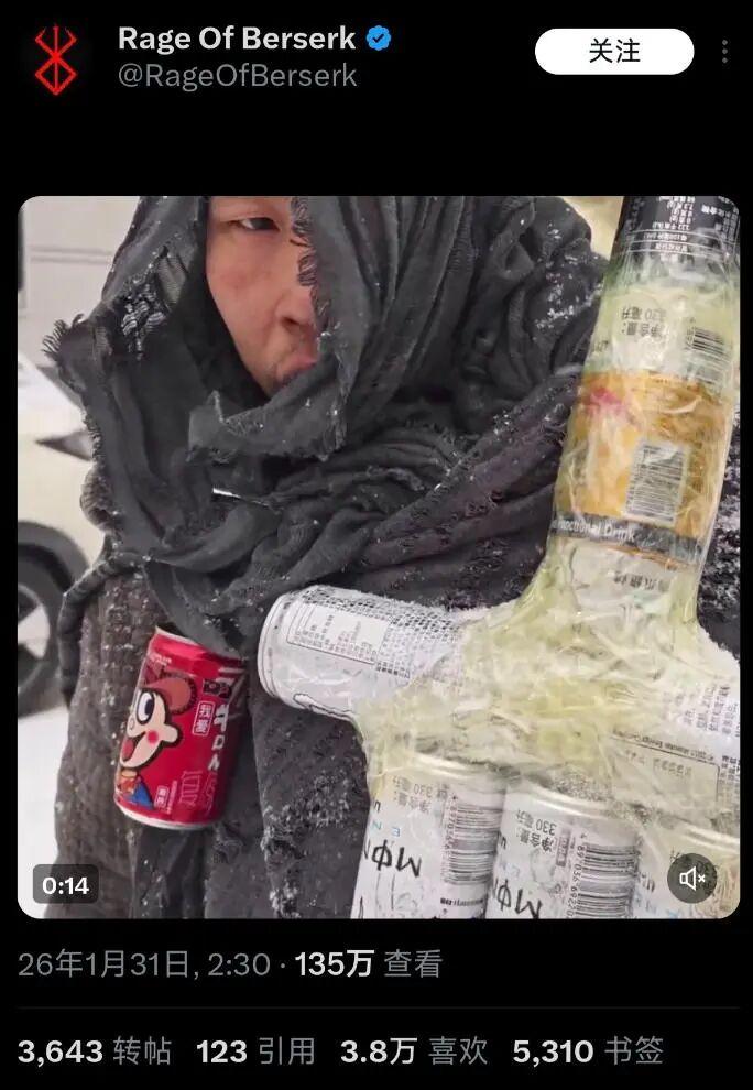 人們刷到了那個奇怪的cos,裏面是一個殘疾在樹下沉睡,漫天的雪蓋住了他的破衣。他們說,剛開始看時感覺挺搞笑的,看久了,卻感覺悲傷無法控制地從心裏往外湧,卻怎麼也表達不出來。