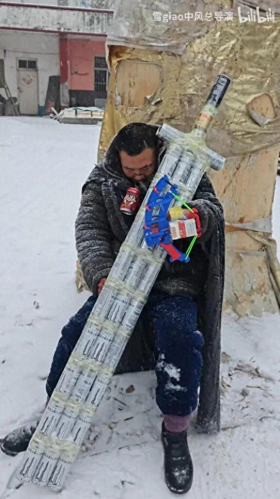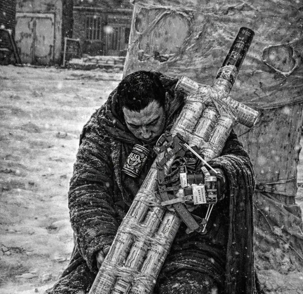 沒有任何修飾,只有一個殘疾的男人身披破布,倚靠在一棵大樹上,取暖用的火焰在他身前舞動,影子和漫天大雪交織在一起。男人抱着一柄大劍,由31個空易拉罐製成。膠布黏住了他的右眼,殘疾的手搭着那柄易拉罐大劍,手上是一把芙蓉王煙盒做成的玩具弩,對應《劍風傳奇》格斯的斷臂與火炮義肢。而在他脖子上,掛着一個代表霸王之卵的旺仔牛奶瓶。