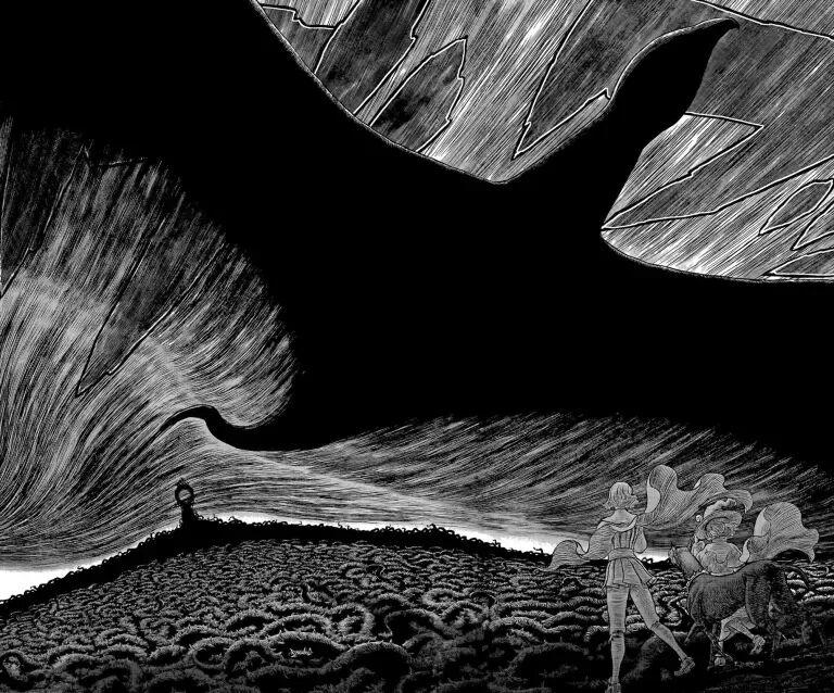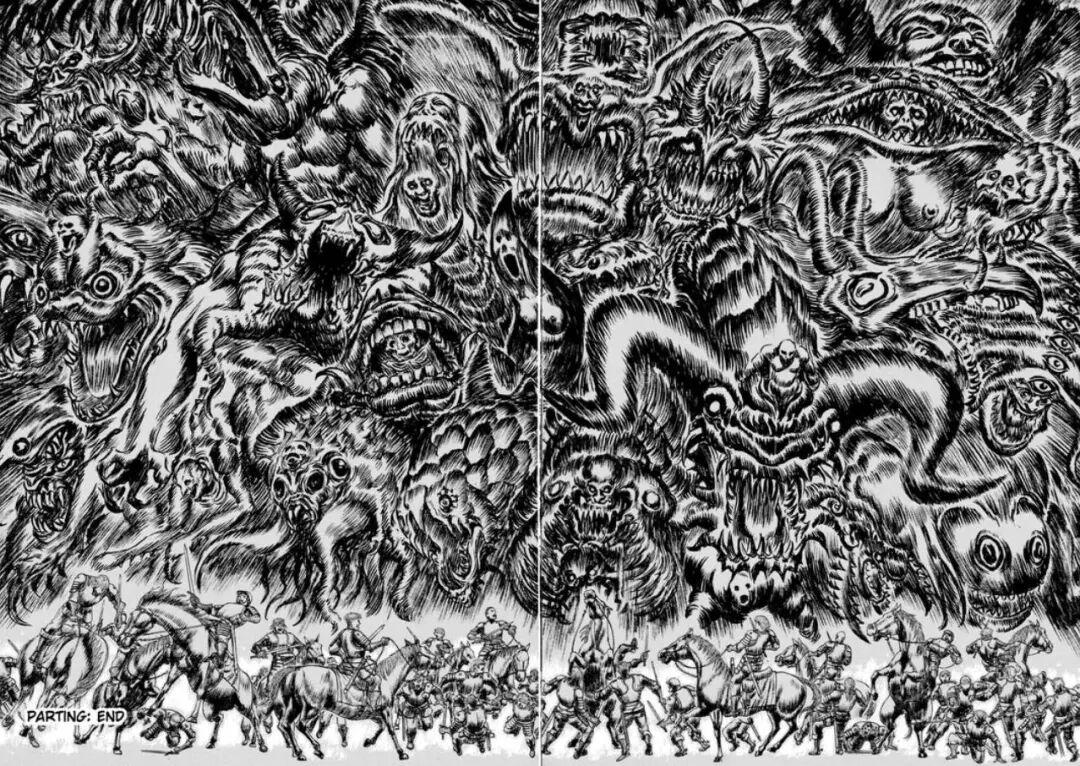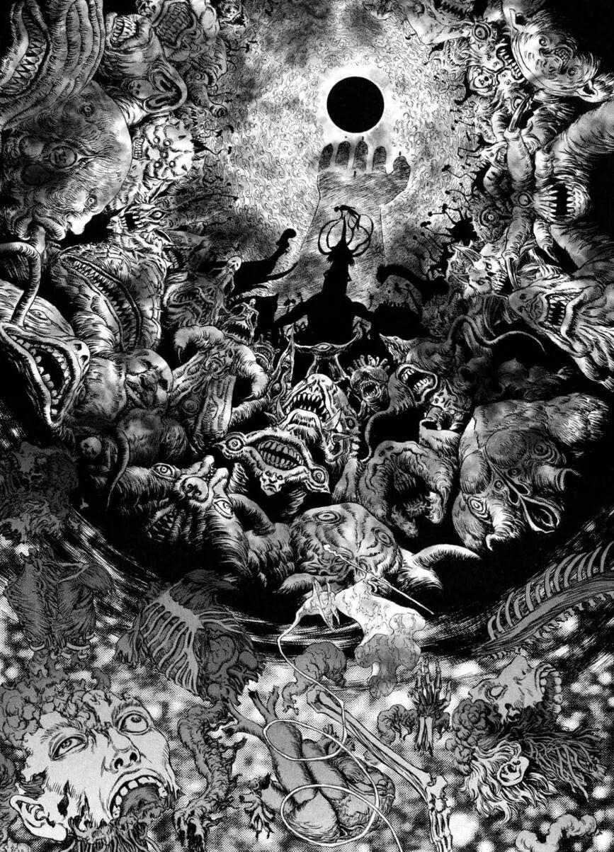 隨後,這一切戛然而止了,想離開鷹之團的格斯,擊潰了格里菲斯,讓他不慎犯錯,被抓住拷打成了廢人。絕望中,格里菲斯用來到手邊的霸王之卵,獻祭了鷹之團,讓大批惡魔“使徒”降臨,在名爲“蝕之刻”的祭奠中,讓惡魔生生喫光先前用整整十卷塑造的鷹之團,以讓自身成神。