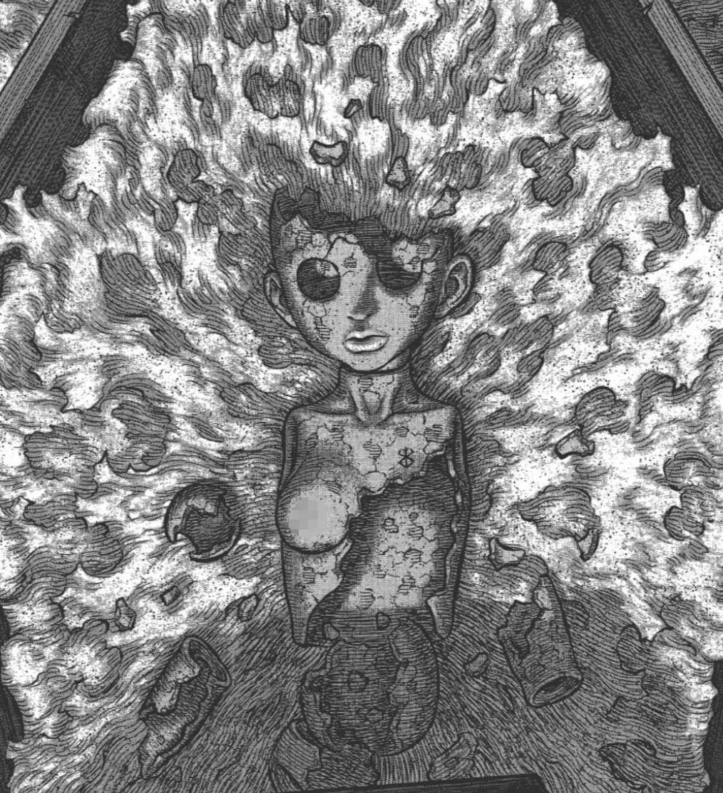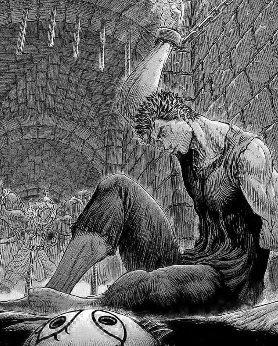 地獄裏只剩下了格斯與卡思嘉,接着,成神的格里菲斯爲了報復,當着格斯的面侮辱了卡思嘉。格斯在狂暴的掙扎中,失去了左手和右眼,並最終被一位神祕的骷髏騎士救離了羣魔。