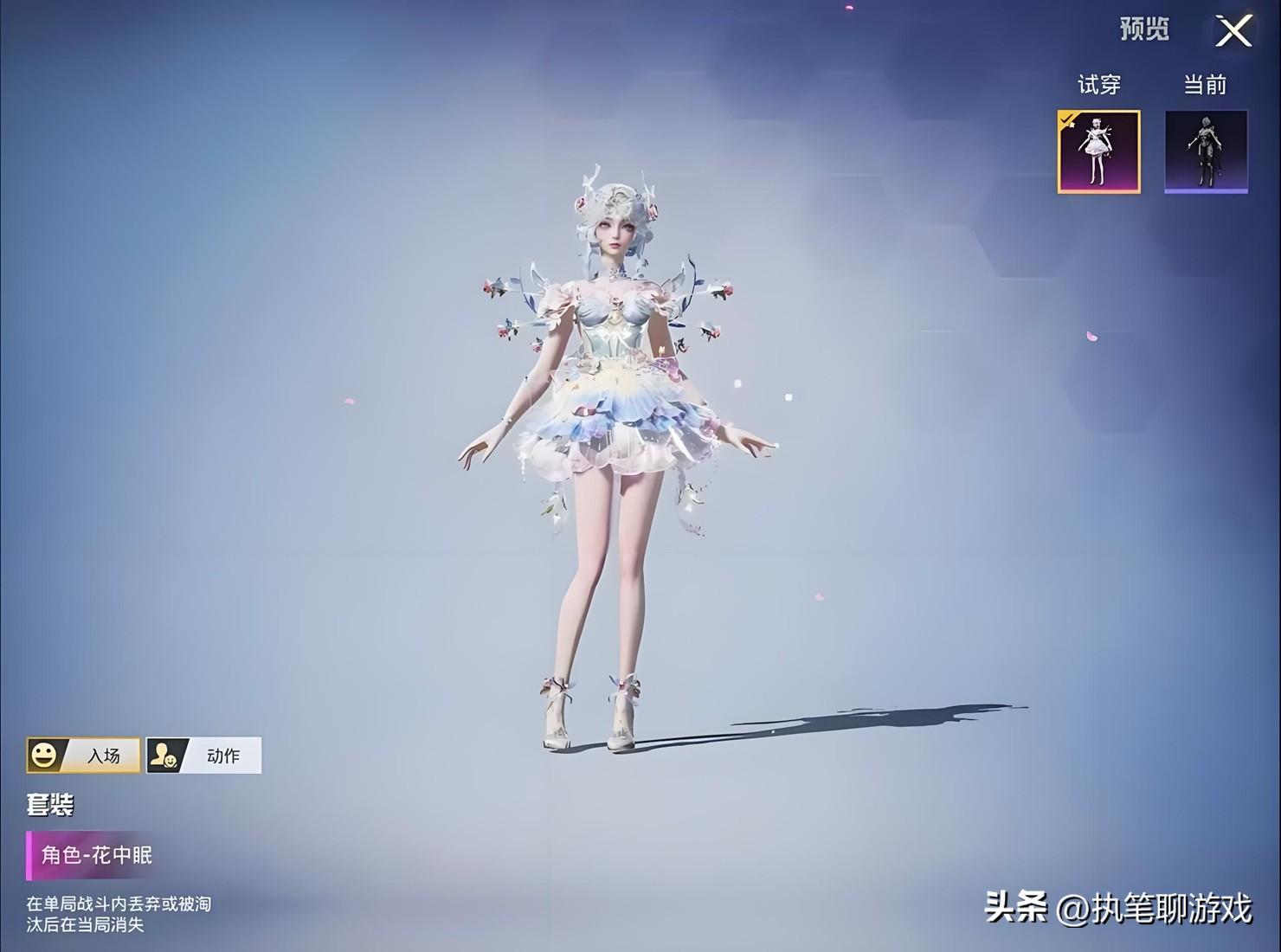 得,言歸正傳,首先說“花中眠”,這個角色屬於夢幻花靈風格,身後還出現了花朵組成的華麗翅膀,裙子則屬於花瓣蓬蓬裙,加上細高跟鞋、點綴粉藍花朵的妝容,讓人眼前一亮。