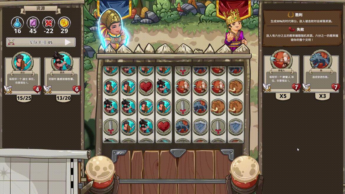 雖然核心玩法是充滿隨機樂趣的老虎機,但真正的策略深度體現在你的牌組構築之中。通過獲取更強大的資源卡牌來優化你的牌庫,確保每一次拉桿都能產生更高收益。你可以利用資源推動科技發展,發掘歷史上的偉大人物爲己所用,也可以訓練軍隊,抵禦外敵或發起遠征。遊戲將資源管理、科技樹和軍事擴張巧妙地融入每一次“轉動”中,讓你在享受老虎機即時反饋的爽快感時,也能體驗到運籌帷幄的深度策略。