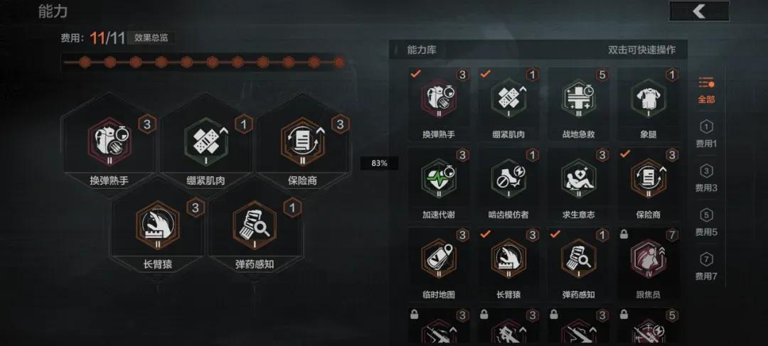此外,戰術能力也是暗區的一大特色,它對玩家生態位的影響更深入。舉個例子,「彈藥估算」是一個很容易被忽略的能力,對高端玩家來說,時刻掌握彈夾裏有幾顆子彈,既會影響那一刻的臨時決策,也決定了對槍時的優劣勢,甚至是一瞬間的勝負。