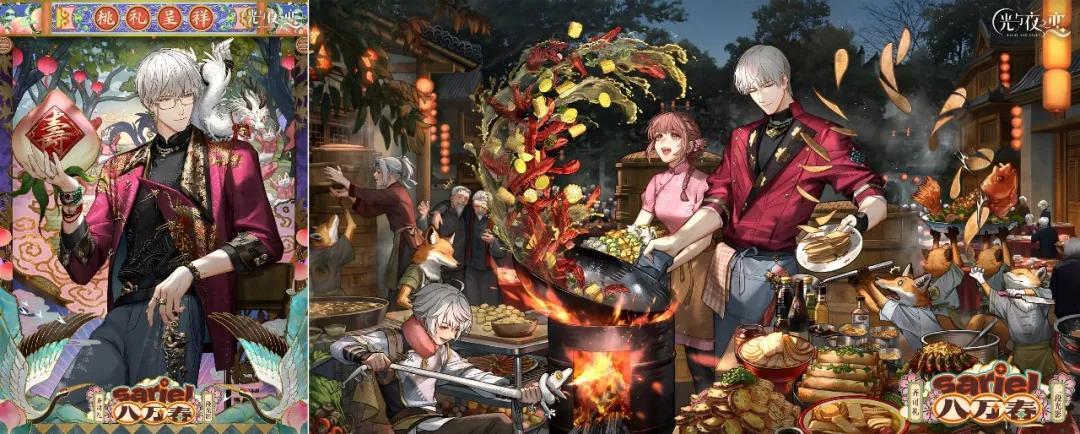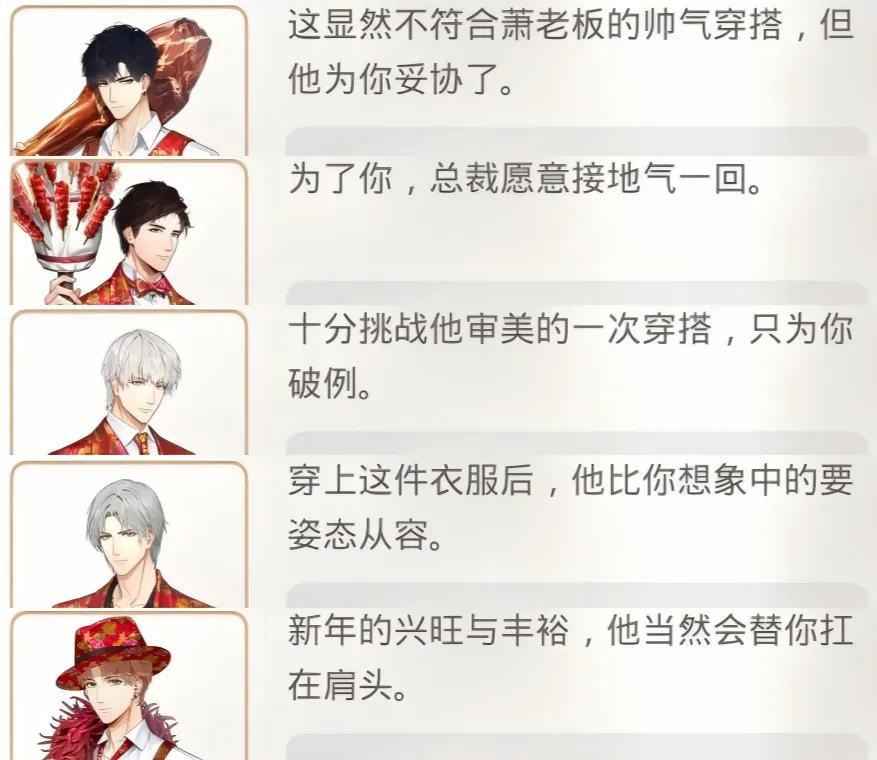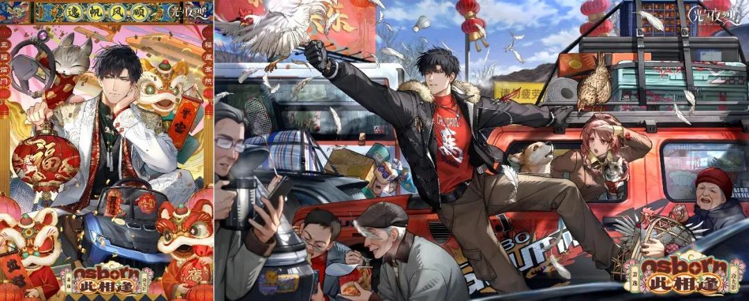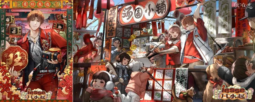而且,這些羣像故事與卡面描述的時刻、活動背景緊密結合,因此與卡面視覺中心的二人世界構成了自然的融合關係:如果用菜來形容,男主與“你”的二人故事,是卡面裏的主菜,羣像故事則是配菜,共同構成一桌味道和諧的盛宴;如果用音樂來形容,愛情是卡面譜寫的主旋律,羣像則像副旋律,與前者合奏出年味兒的曲調。