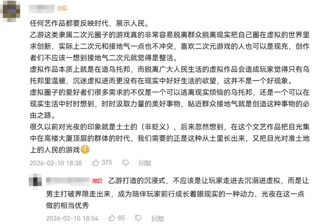 多巴胺快感固然能直接讓人臉紅心跳,但生活中的種種,關於人生價值觀的思考……這些內容才更讓人流連、回味。用玩家的評論來說,《光夜》不是讓人沉溺於虛擬幻想世界,反是讓玩家從遊戲中汲取面對現實的力量、去發現美好事物。從某種程度上來說,或許《光夜》也在「滋養」、陪伴玩家生活和成長。