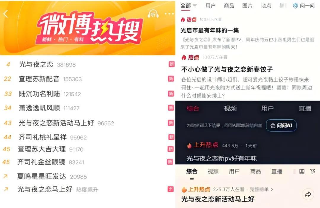 然而,就是這麼一個看似挖坑的主題,居然又讓《光夜》在全網刷屏:早在一週前新春活動PV釋出時,《光夜》就在微博、小紅書、抖音等平臺衝上了熱搜/熱點。