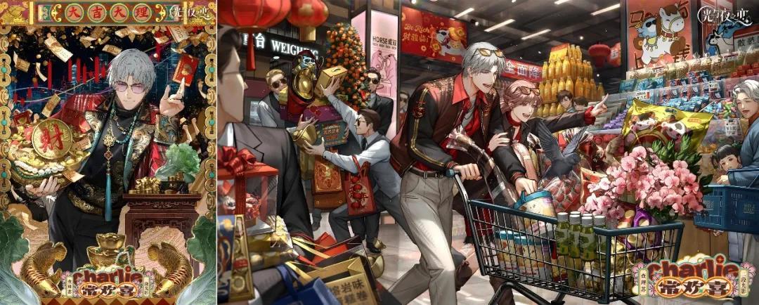 人設上有點「鑽石王老五」意味、錢多花不完的查理蘇,與“你”在超市採購年貨,購物車已經滿到不行,兩人卻指着前方笑開了花,看來還要繼續買買買。一旁的婆婆和孫女投來了好奇的目光;遠處的情侶/夫妻循着笑聲也看了過來;查理蘇的管家們則在後方努力維護着年貨們的“安全”。