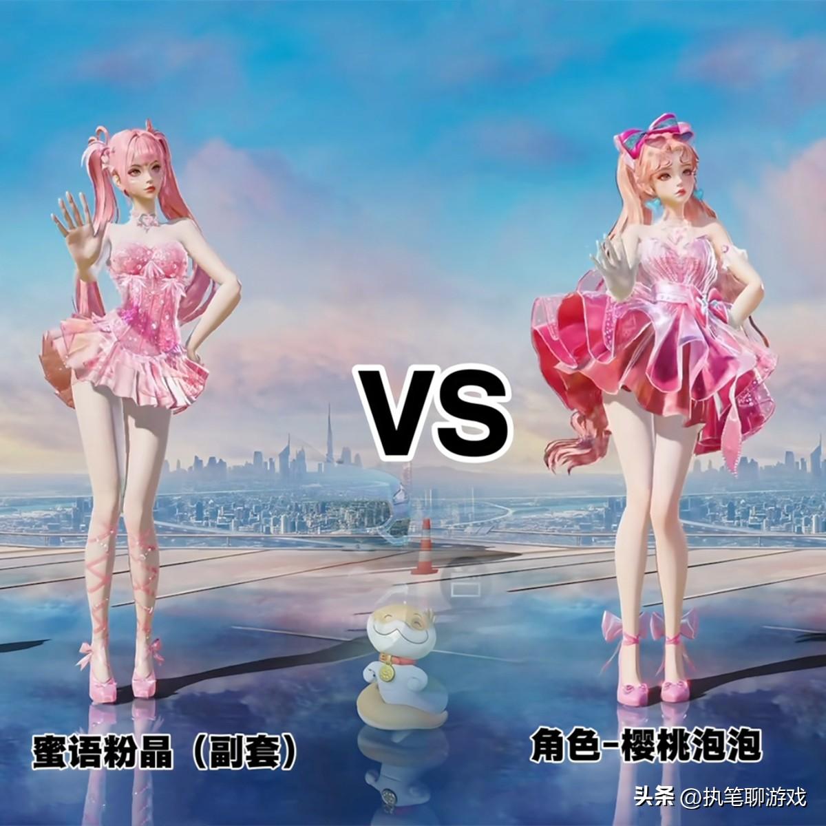 這兩個美女角色均爲粉色系列,而且都是連衣裙,區別是一個修身版,一個是蓬蓬裙,都有着極致的五官和妝容,屬於同一個級別的嬌俏可愛類型。
