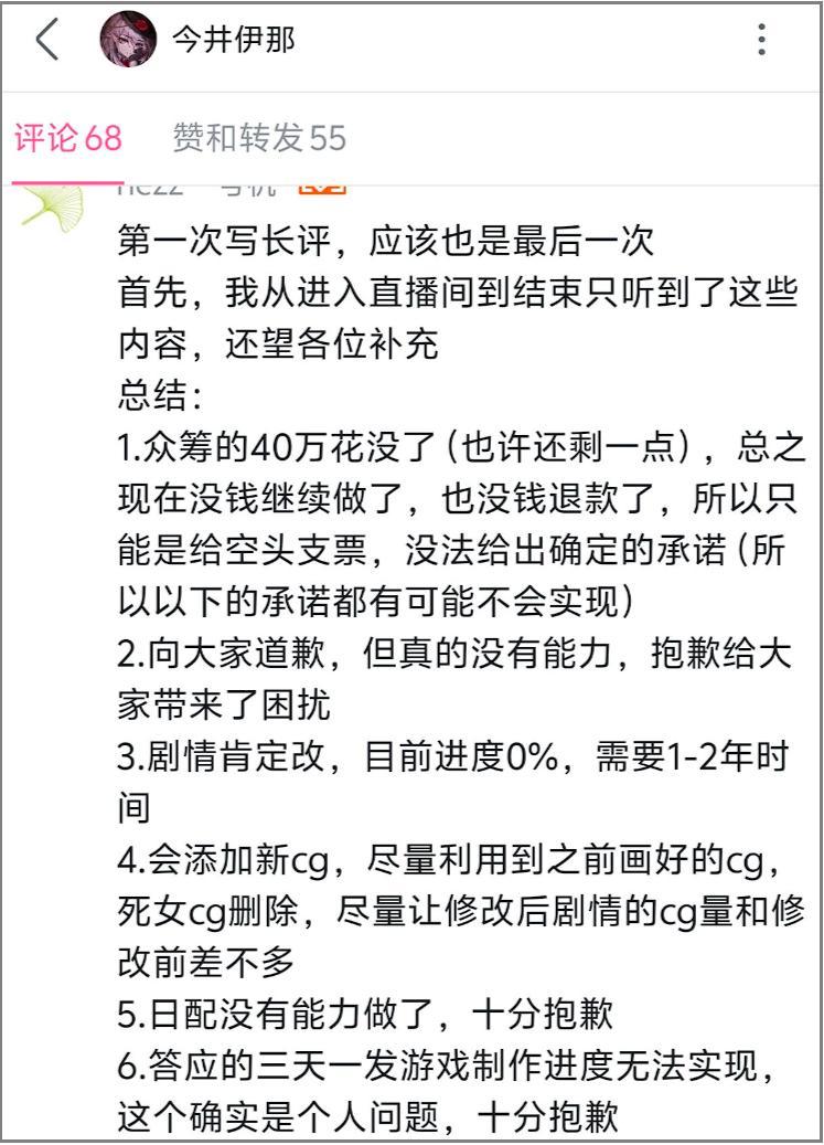 更雪上加霜的是,一系列連鎖反應接踵而至。之前承諾的日語配音項目,因爲沒錢,被迫取消;玩家們詢問劇情重置的進度,今井也只能含糊其辭,無法給出明確的回應。