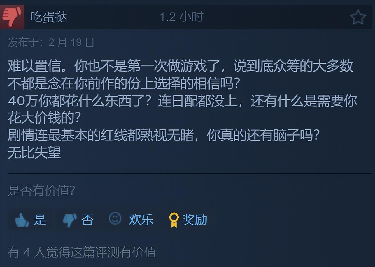 然而發售一個月之後,《永生之庭》不僅沒賺到大錢,遊戲社區也變成了大型修羅場。Steam褒貶不一,玩家和開發者互相拉扯,衆籌支持者喊着退錢,路人喫瓜喫出連續劇。