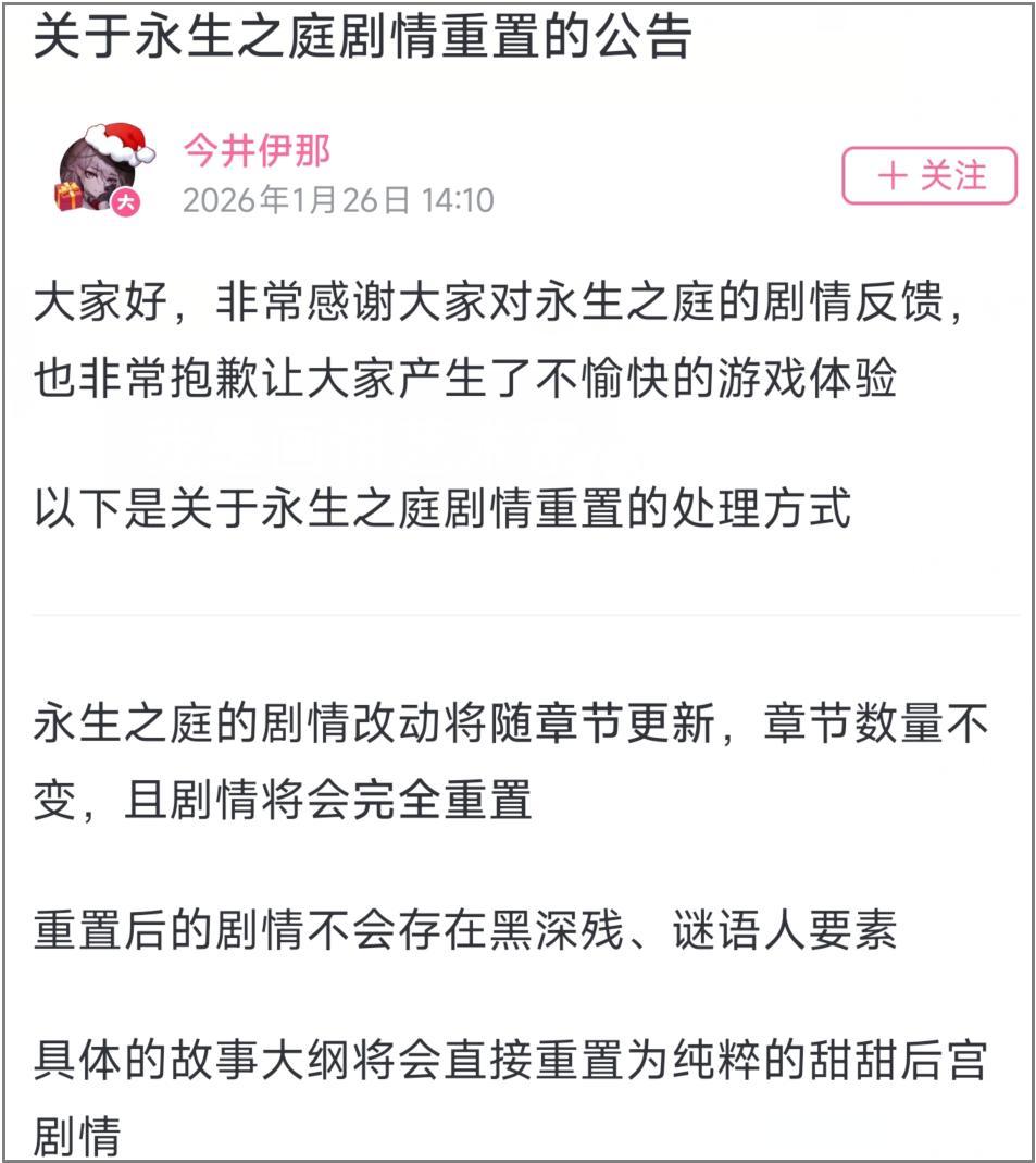第二個節點,是劇情方向的認錯。面對欺詐差評,今井伊那發公告承認劇情方向出了問題,宣佈將重置遊戲劇情,改回玩家期待的甜結局。