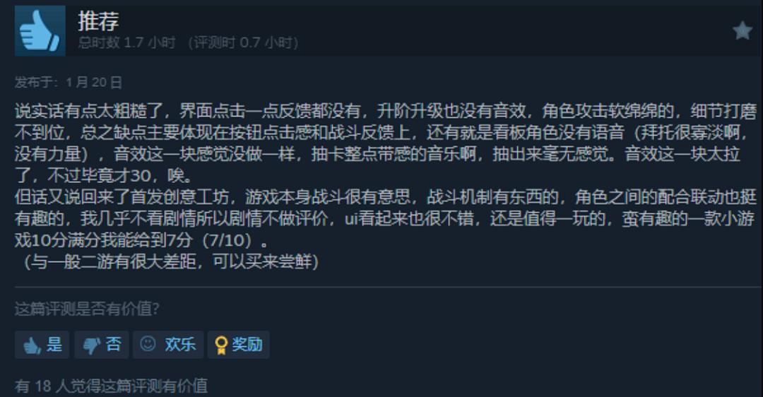 戰鬥、養成、抽卡、戀愛,四個模塊縫在一起,雖然打磨粗糙,居然還算自洽。至少在發售前幾天,遊戲的口碑其實是不錯的,好評率有79%,距離“特別好評”只有一步之遙,玩家們也傾向於給出未來可期的評價。