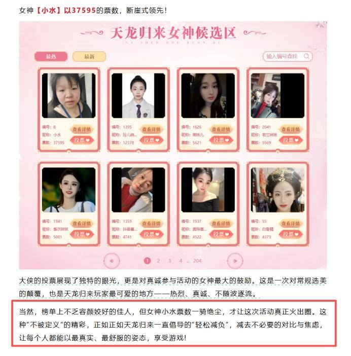 大致流程是由玩家提交真實照片與材料,經由官方覈對無誤過後,再由全體天龍玩家投票選出人氣女神。