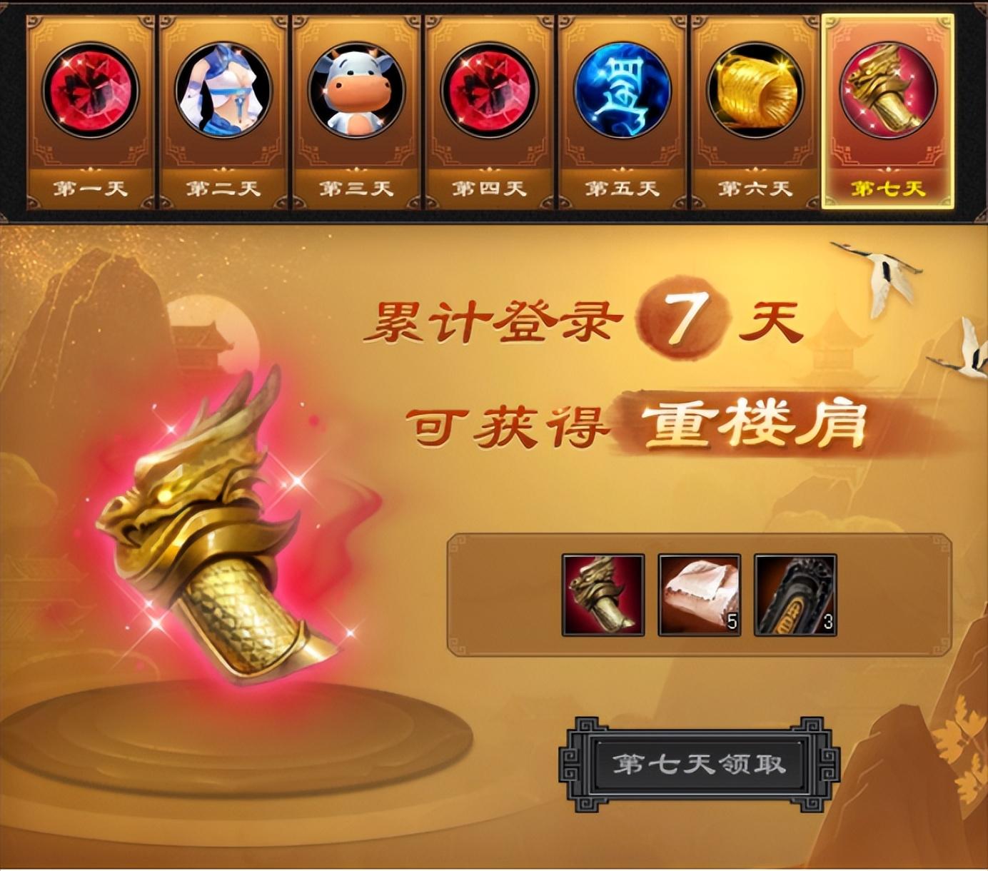 砍掉大量冗餘的養成系統,現在登個遊戲累計簽到7天,就能免費領取頂配神器重樓肩。