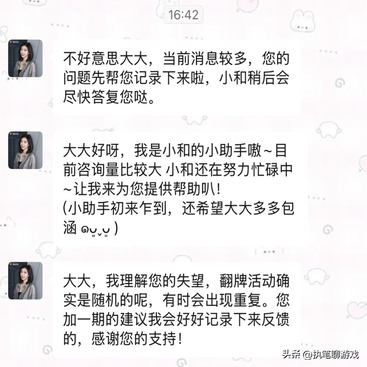如圖所示,當告知“管家小和”有關翻牌重複的發現之後,對方的回覆中說明:“翻牌活動確實是隨機,有時會出現重複”。