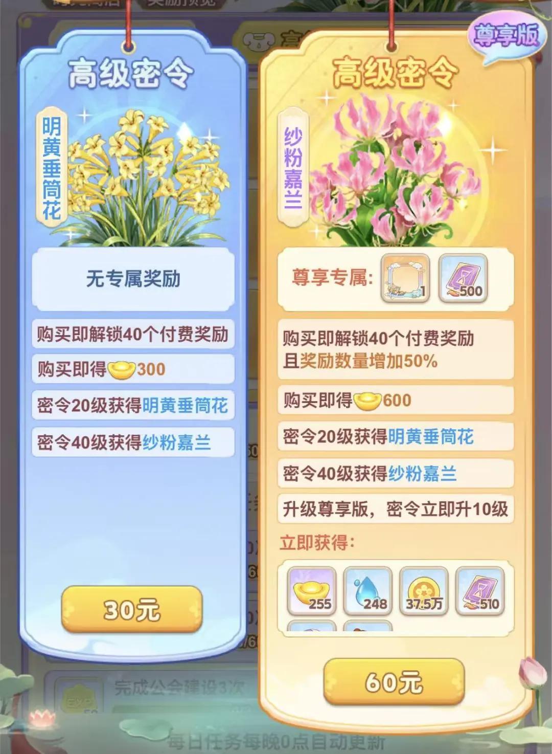 做到這一步,還不算完。就算你終於整出了花靈,每天能產出的月亮幣還是有上限的,而且這個上限較低,想到你前面已經投入了這麼多錢和功夫,這點月亮幣顯然有點不夠玩,於是你又要開通花之密令,相當於通行證,這樣才能提高月亮幣產出上限,提高養成效率。