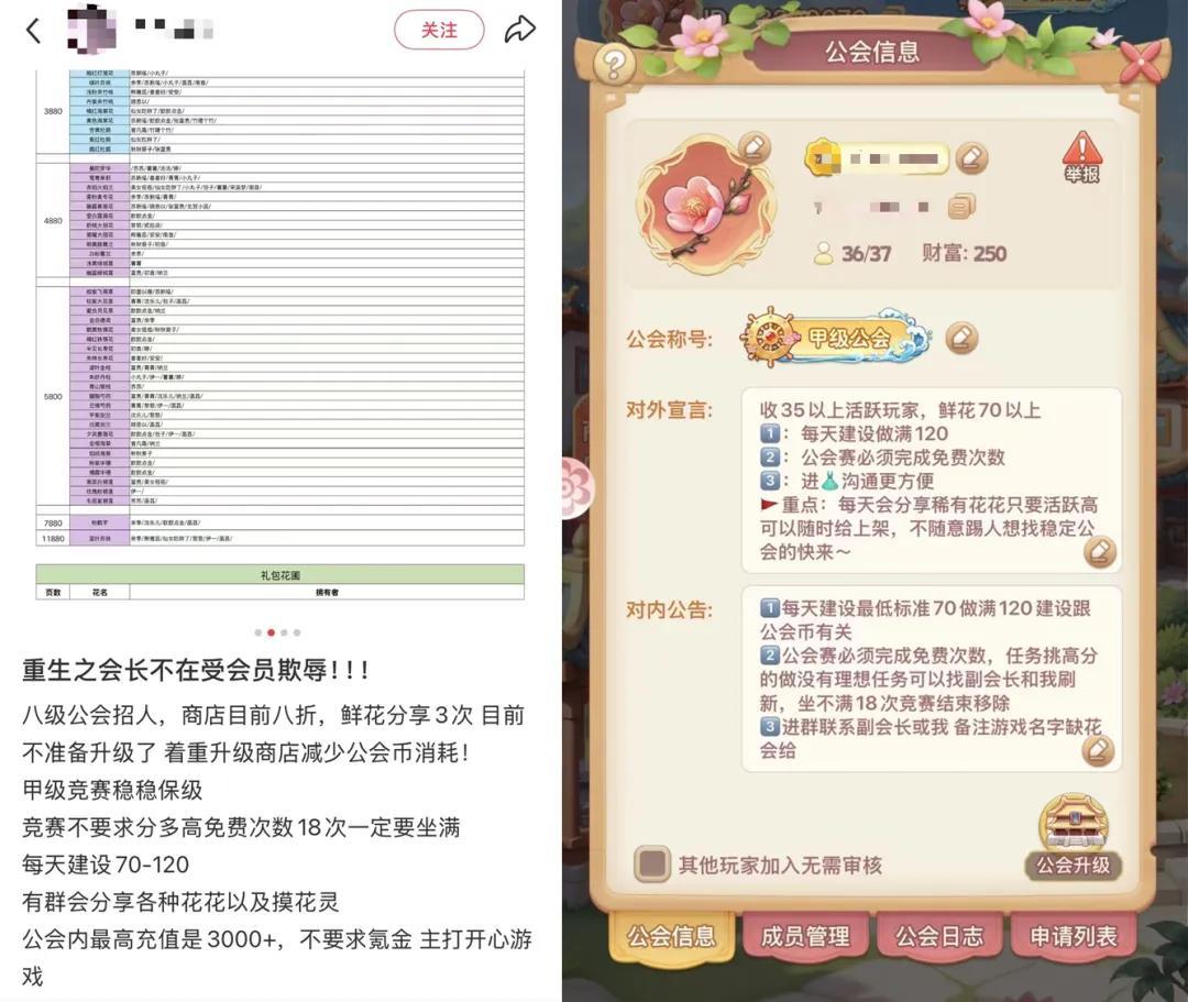也不全是。基於遊戲的“偷花”玩法,玩家可以去好友的花地裏偷花,或者在公會里獲得其他玩家分享的鮮花。因此,不少玩家也會把《我的花園世界》比作披着種田外衣的SLG——大哥(姐)帶着一羣小弟(妹)玩遊戲。