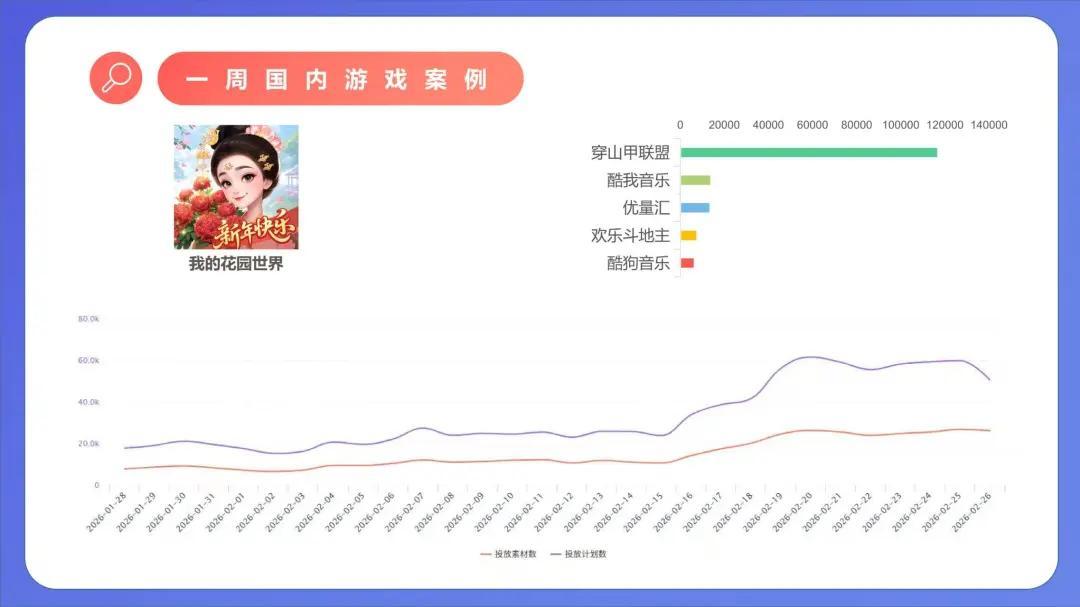 而在春節期間,他們又加大了營銷力度。不僅放大了線下領真花的噱頭,還找來楊紫代言,進一步打開聲量。據DataEye統計,《我的花園世界》從2月14日情人節開始增加買量投放,並登頂了中重度手遊周投素材榜。