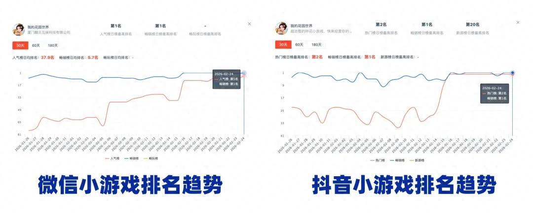 先看它的離譜成績。在小遊戲方面,自除夕開始,《我的花園世界》就衝上了微信和抖音小遊戲雙平臺的暢銷榜第一,並在春節期間持續霸榜。