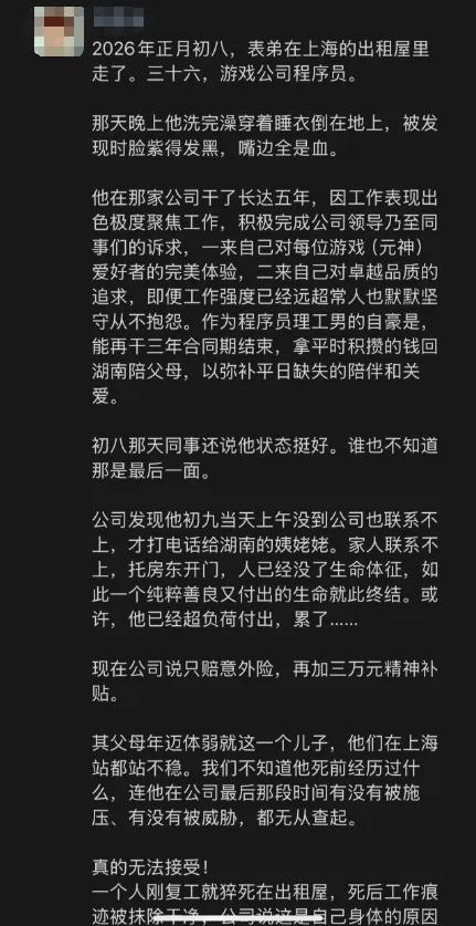 今日,有關米哈遊員工不幸離世的消息在網上流傳。有疑似員工家屬在朋友圈發文稱,該員工作爲程序員,已在米哈遊工作5年有餘,在春節復工後突然離世。