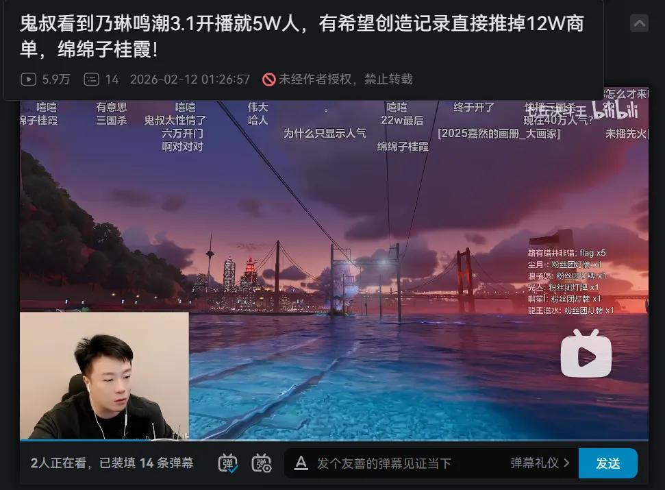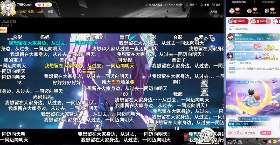 第三點就很神奇了。本身在2個多月的遊玩裏,乃琳直播間就已經積蓄了一大批忠實觀衆,開播就有了5萬同接。而3.1又是《鳴潮》粉絲們力推的好內容,於是在熱度新高的時刻,不少人開始呼朋喚友、主動引流,甚至有頭部主播推掉自己的直播,趕來聲援乃琳……