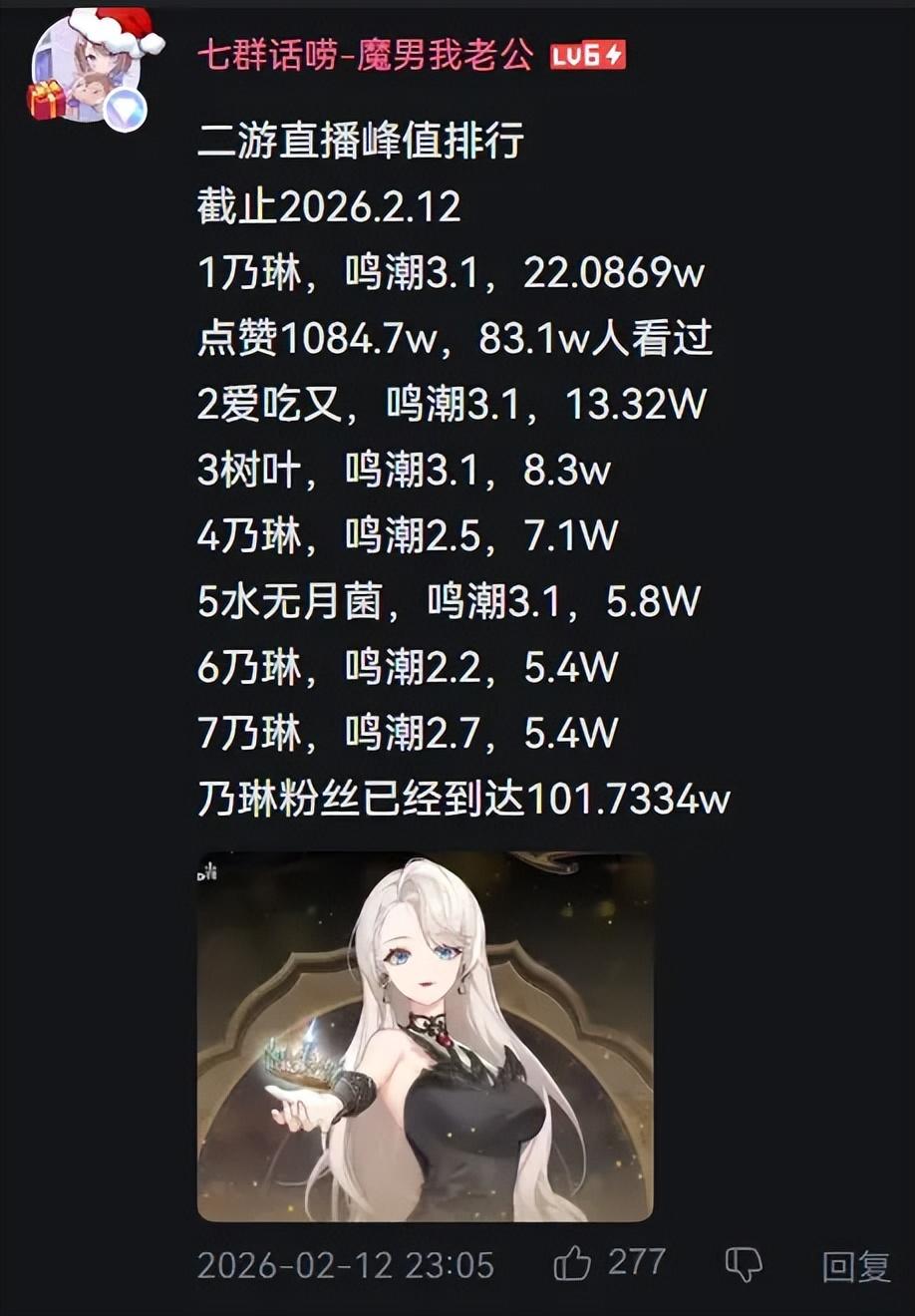 至此,在所有直播《鳴潮》的主播中,乃琳拿下了一個斷檔式領先的峯值,粉絲數也順勢突破了100萬。
