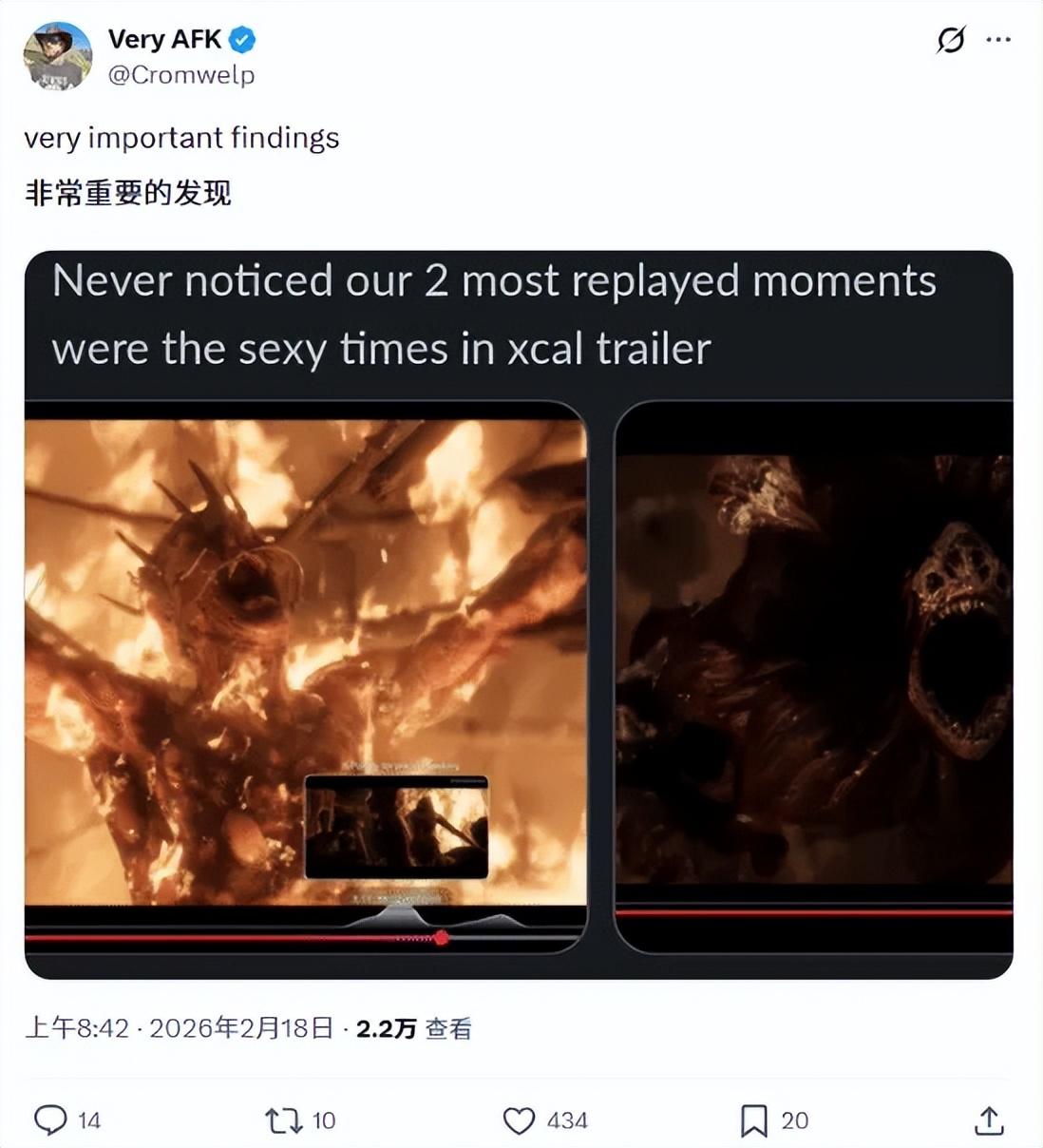 拉瑞安工作室的發行總監在X平臺上發佈了一項“重大發現”:《神界》預告片中的成人場景重播次數是全片最高!