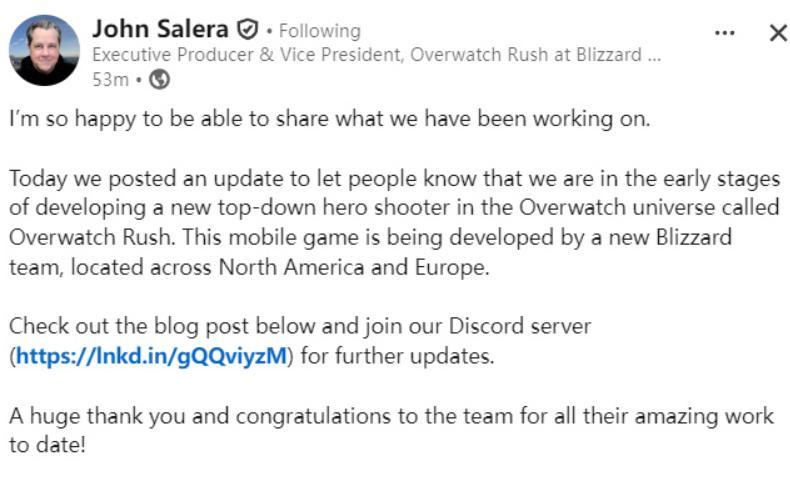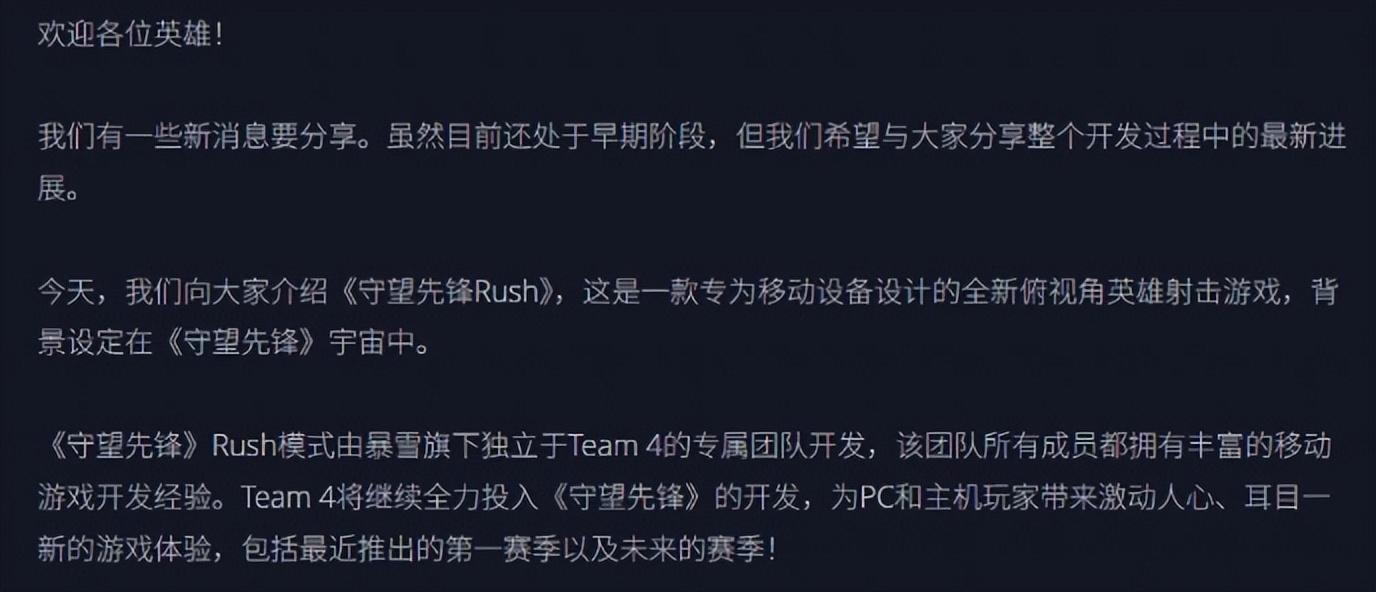 好消息:《守望先鋒RUSH》並不是原班人馬Team 4開發,不會耽誤守望端遊這一年的進度。