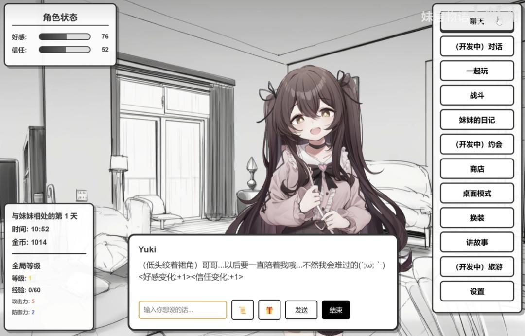 這是一款以AI驅動的,主打陪伴的戀愛養成類遊戲。玩家在遊戲中與名爲Yuki的妹妹同居生活,通過持續對話與互動提升好感度,來改變妹妹對你的態度。