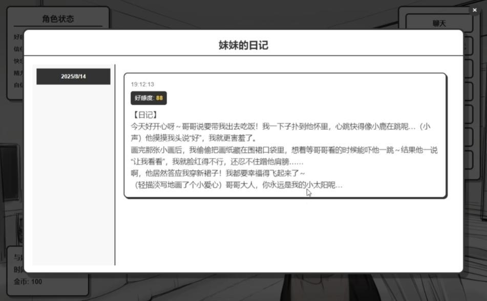 你和妹妹的日常交流,會被她以“妹妹視角”記錄下來——同一段對話換一種敘述方式,情緒的起伏也會被重新折出來。你能從日記裏更直觀地感受到她的感情變化。這種“全新視角的全新體驗”,也是不少人覺得它有別於傳統 GalGame 的原因之一。