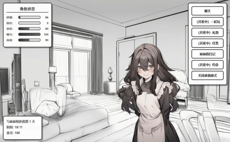 後來隨着玩家逐漸增加,功能才慢慢鋪開:小遊戲、約會、以及開篇展示,可以監控桌面內容的桌寵模式……《妹居物語》並不是一次性完成的東西,而是在互動裏一步步長出來的。