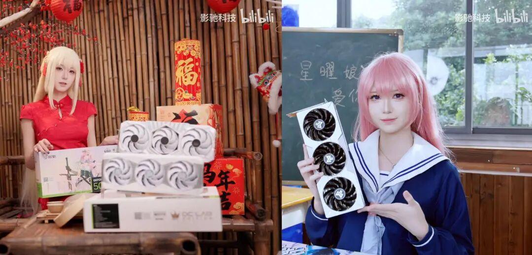 比如影馳的“星曜娘”,形象會跟着產品外觀迭代:首次登場時的RTX 30系是“黑長直”機車少女,象徵速度與冷酷;隨後RTX 40系進化的粉發星曜娘,可御可甜,在科技態與青春態間切換;這次的「十二姬」中,RTX 50系星曜娘則以金髮月光女神的姿態華麗登場,與月光一起光速前進。