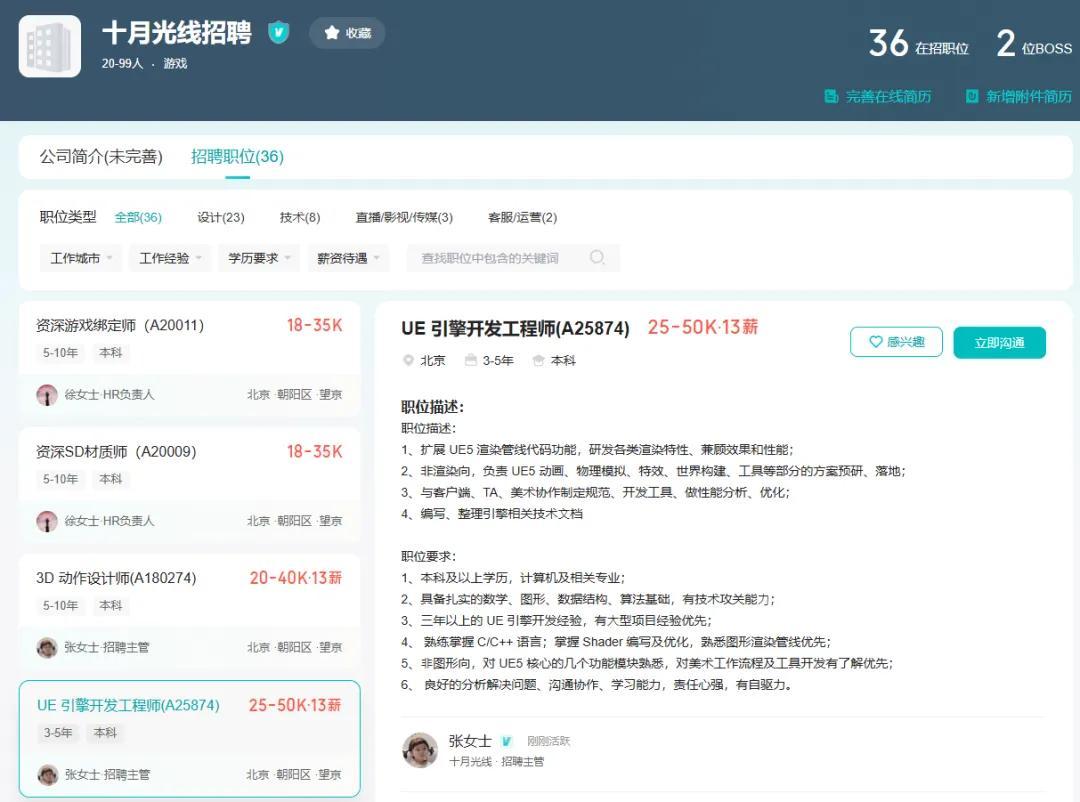 順帶一提,田曉鵬在遊戲領域還有更多嘗試。2025年初,曾發行《大聖歸來》《哪吒2》的光線傳媒在業績說明會上表示正在組建遊戲公司,計劃憑藉動畫電影領域的製作資源,用遠低於遊戲行業的成本,花3年左右推出首款3A大作。同年5月,光線影業與田曉鵬、劉威合資成立了十月光線。從對UE引擎人才和發行負責人的招聘需求來看,他們應該在籌備一款大型3D遊戲。