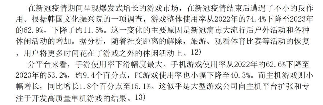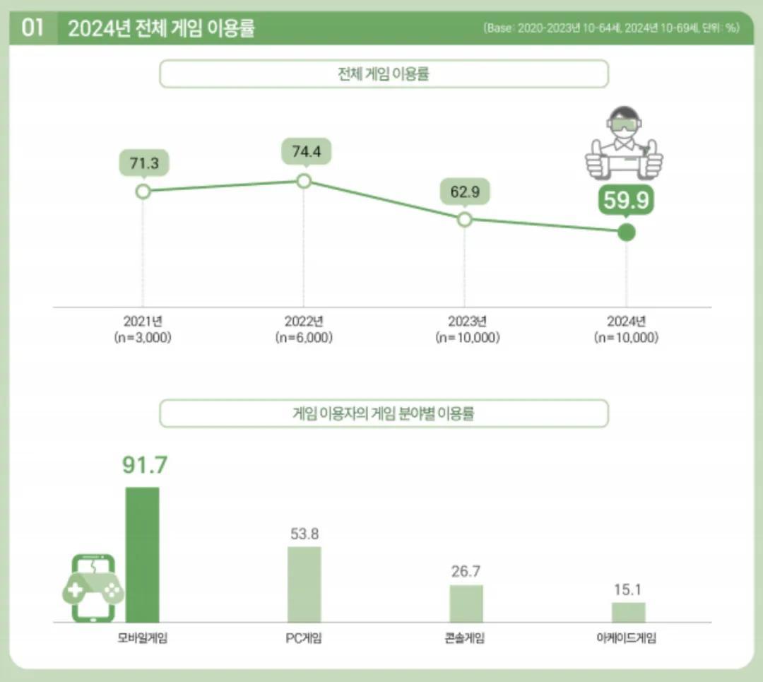 同樣,韓國文化內容振興院(KOCCA)的遊戲報告顯示,2024年韓國用戶整體遊戲使用率跌破60%,基本盤持續縮水。但其中主機遊戲用戶使用率,反而在2023年逆勢增長。這意味着全球化和主機大作,已是韓國遊戲行業的破局首選。
