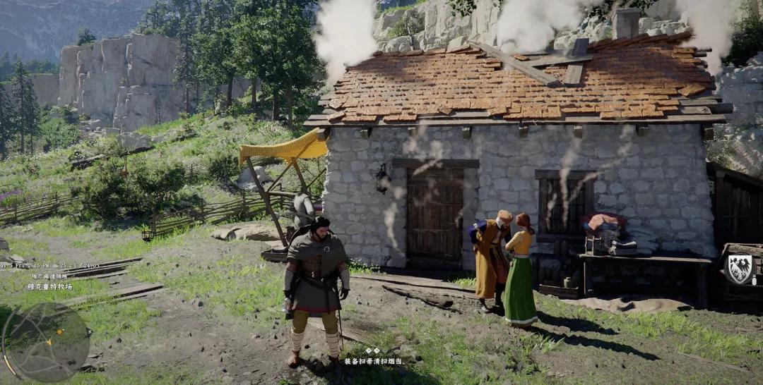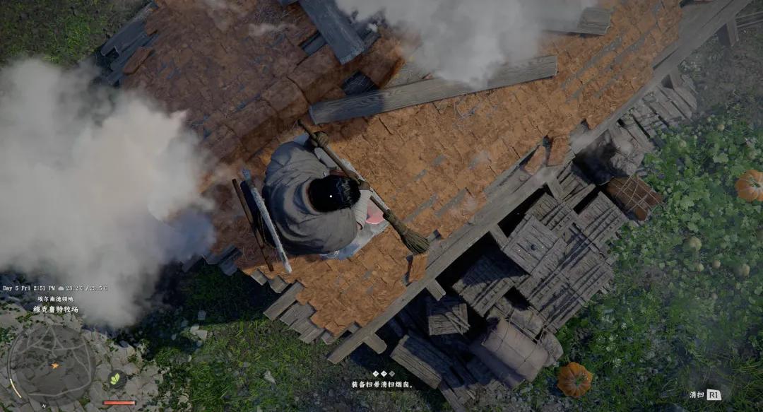 其次,過度擬真帶來了部分反直覺的體驗。比如打掃煙囪,我的第一反應是進屋(畢竟屋子在冒煙),而當我剛用劍給屋裏的牀鋪來了個物理清掃後,策劃才提示我要上房站在煙囪上;
