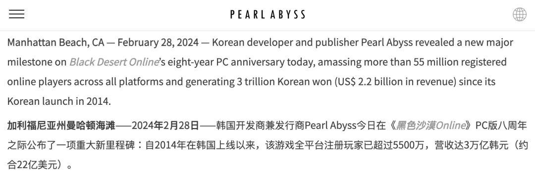 如前所述,他們是《黑色沙漠》(下稱黑沙)的研發商,雖然這款遊戲在中國市場不算出名,但絲毫不影響其作爲韓國的國民MMO:截至2024年,黑沙官方宣佈遊戲累計收入超過3萬億韓元(約合人民幣140億元),這爲紅沙的研發提供了充足的資金保障。