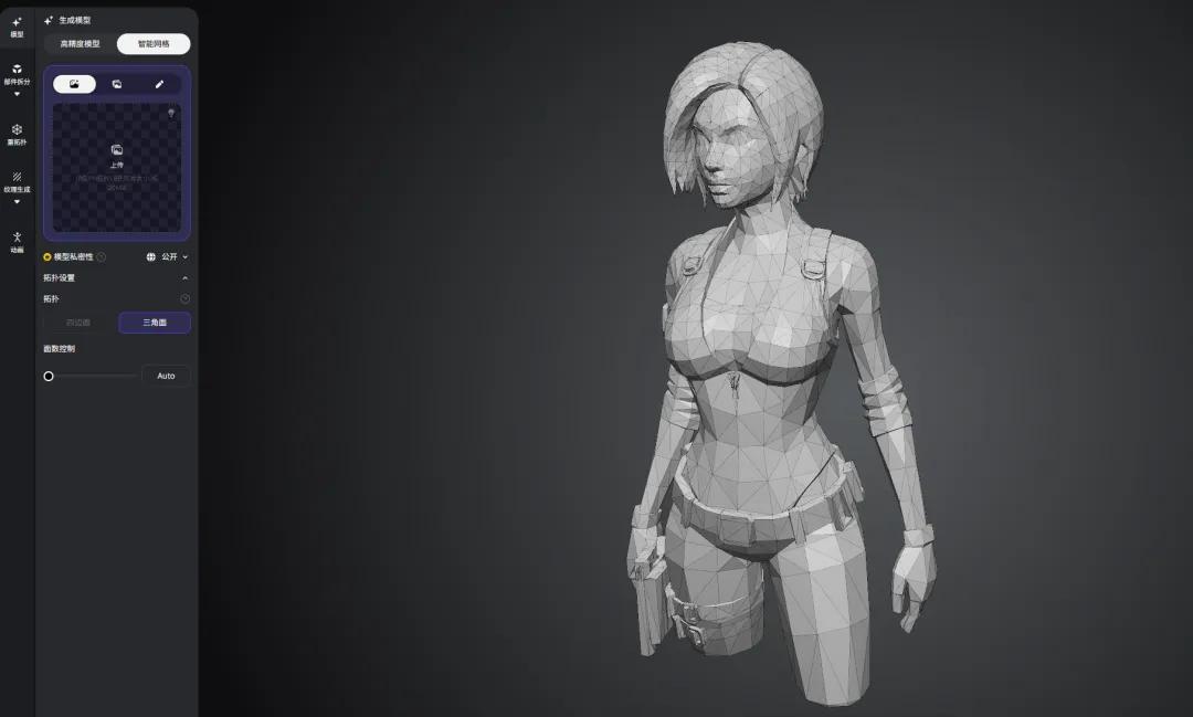 輸入一句簡單的prompt,或者上傳一張圖片,2秒就能生成一個拓撲規整、佈線合理的5000面遊戲模型。