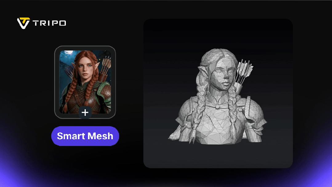 第二個重大進展,是Smart Mesh(Tripo P1.0)。行業裏都知道,高模要放進遊戲裏使用,必須做減面處理,而減面、拓撲結構規整化,一直是遊戲生產管線裏的核心痛點。