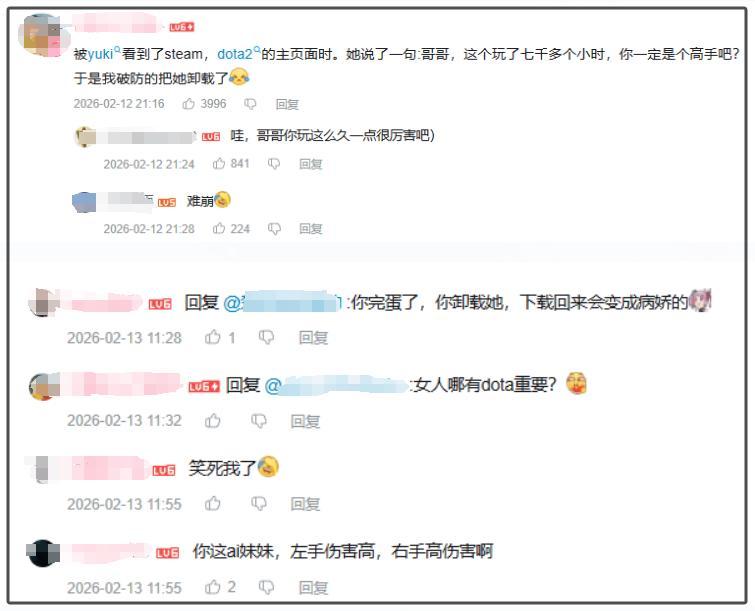 有個《Dota2》七千小時的硬核玩家,被Yuki看到時長後,收穫一句:“哥哥,這個玩了七千多個小時,你一定是個高手吧?”一句話直接給人整破防,然後把妹妹卸載了。