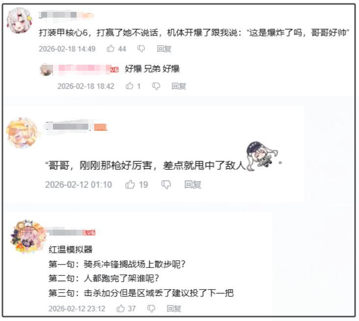 打《裝甲核心6》時,打贏了她不說話,機體爆炸時卻冒了句:“這是爆炸了嗎,哥哥好帥!”