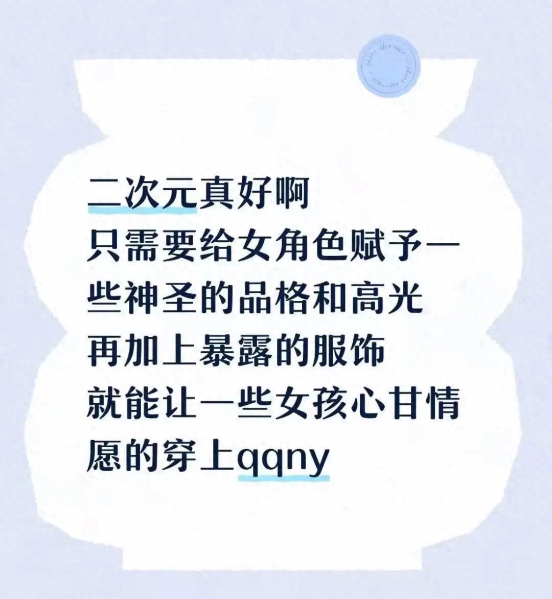 但理想照進現實,往往還有一段距離。在二次元社區裏,有一類聲音依然存在:「二次元真好啊,只需要給女角色賦予一些神聖的品格和高光再加上暴露的服飾,就能讓一些女孩(cosplay時)心甘情願的穿上qqny。」