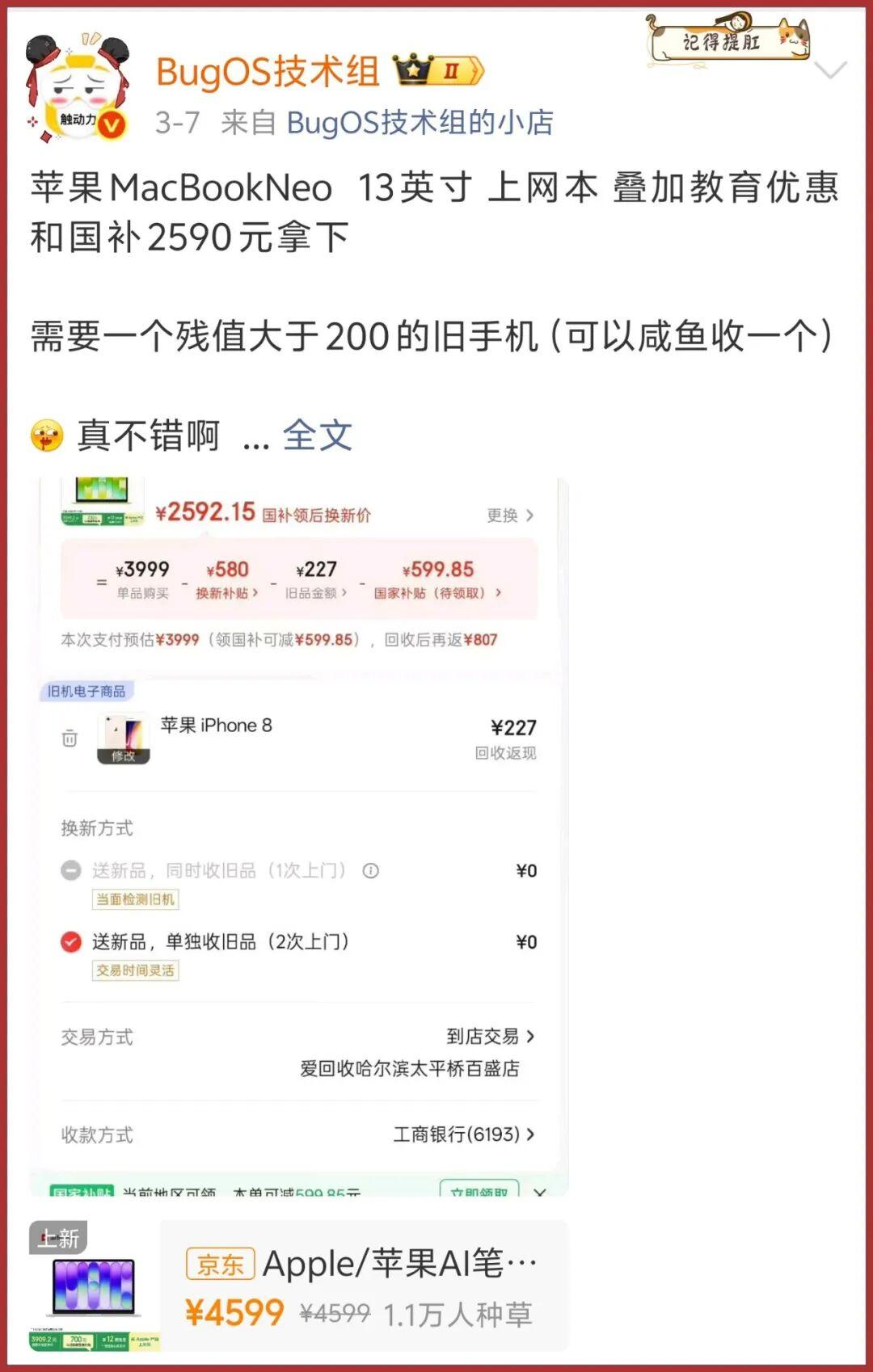 另一邊,明天(3月11日)原價¥4599的MacBook Neo也要正式發售了,也是一款話題十足、爭議不斷的新品。